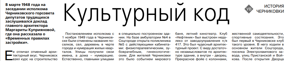 В марте 1948 года, был заслушан доклад главного архитектора Маргариты Куприяновой, где она рассказала о «Временных правилах застройки» Черниковска.
